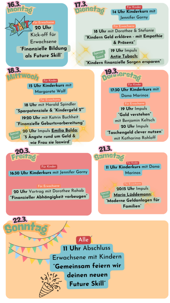 Lust auf die Inhalte der Money Future Skills Week aber du weisst jetzt schon, dass du in der Zeit vom 16. bis 22. März 2026 nicht genügend Zeit haben wirst, selbst oder mit deinem Kind teilzunehmen?! Mit dem Nichts-verpassen-Paket sicherst du dir die Aufzeichnungen der Money Future Skills Week!